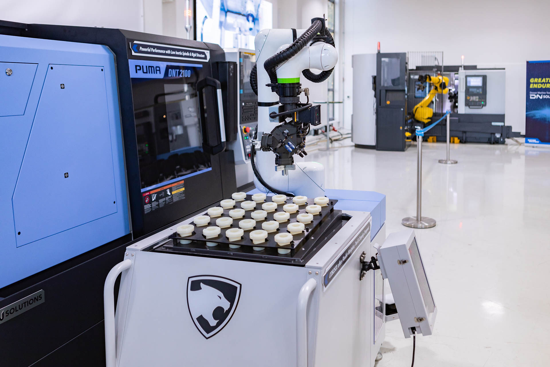 主展廳由五軸機(jī)、復(fù)合機(jī)、自動(dòng)化等三個(gè)主題展區(qū)組成。展出了迪恩機(jī)床最新的五軸機(jī)產(chǎn)品陣容——DVF系列(DVF 4000、DVF 5000、DVF 6500),新一代復(fù)合加工機(jī) PUMA SMX 2100ST、PUMA SMX300ST、PUMA TT2100SYYB,以及配備了協(xié)作機(jī)器人COBOSOL、桁架(Gantry Loader)、機(jī)器人單元(Robotcell)等自動(dòng)化裝備的PUMA DNT2100M、PUMA TW2600M、Lynx 2100LSYB等機(jī)型。另外,在這里參觀者還能近距離觀看迪恩機(jī)床的最新機(jī)型DNM 5700立式加工中心和VC 4000DA-2SP雙主軸立式加工中心。